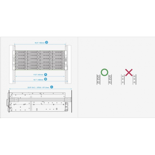 • Vzdialenosť medzi dvoma rackovými stĺpmi (meranie štvorecových otvorov racku stred-stred) je 18,3" (465 mm)