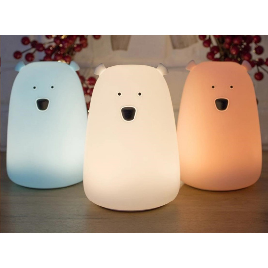 je vyrobená z príjemného a mäkkého silikónu. Vďaka možnosti výberu zo troch farebných prevedení je skvelou voľbou ako do dievčenskej, tak aj chlapčenskej izbičky. Tento roztomilý kamarát bude svojím príjemným svetlom robiť vašim deťom spoločnosť pri večernom zaspávaní, ale pokojne aj chvíľu po ňom. V prípade, že medvedíka zabudnete vypnúť, sám sa po 2 hodinách svietenia automaticky vypne. Deti si svietiaceho medvedíka natoľko obľúbia, že ho budú chcieť brať so sebou aj na dovolenku či víkendový pobyt. Lampička je určená na svietenie, nie je hračkou.