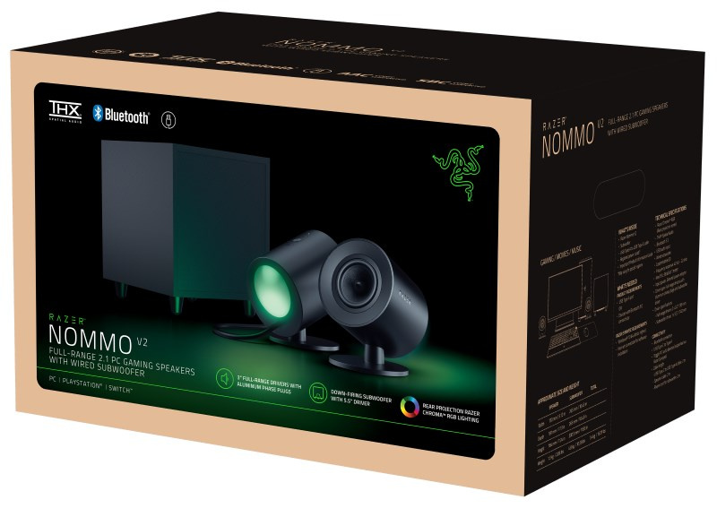 Nastavte zvukovú scénu pre víťazstvo s Razer Nommo V2 — herný reproduktorový systém a subwoofer s plným rozmerom navrhnutý pre vysoce verný zvuk zaplňujúci miestnosť a strhujúce basy. Vďaka technológiám THX® Spatial Audio a Razer Chroma™ RGB sa pripravte na pohlcujúci zážitok, ktorý sa rozprestiera naprieč zrakom i zvukom.