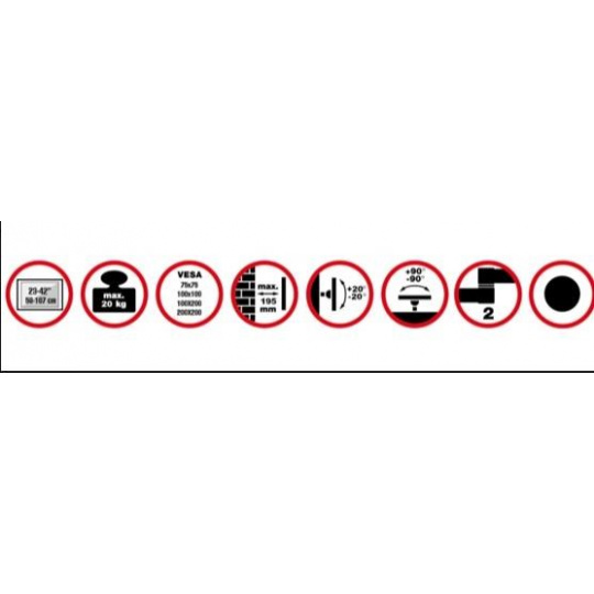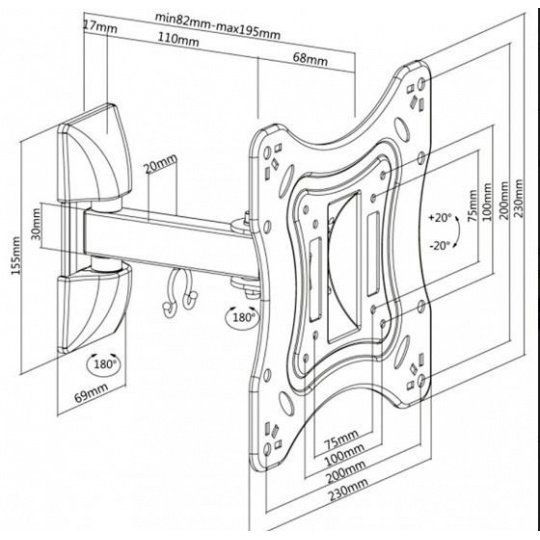 Nástenný držiak pre LCD monitory a televízory s uhlopriečkou 23"- 42" (58-107 cm) a maximálnou hmotnosťou 20 kg. 2x záves, vertikálne výklopný +20°/-20° a horizontálne otočný +90°/-90°, vzdialenosť od steny 82-195 mm, materiál oceľ, farba čierna. Montáž VESA: 75x75, 100x100, 100x200, 200x200...