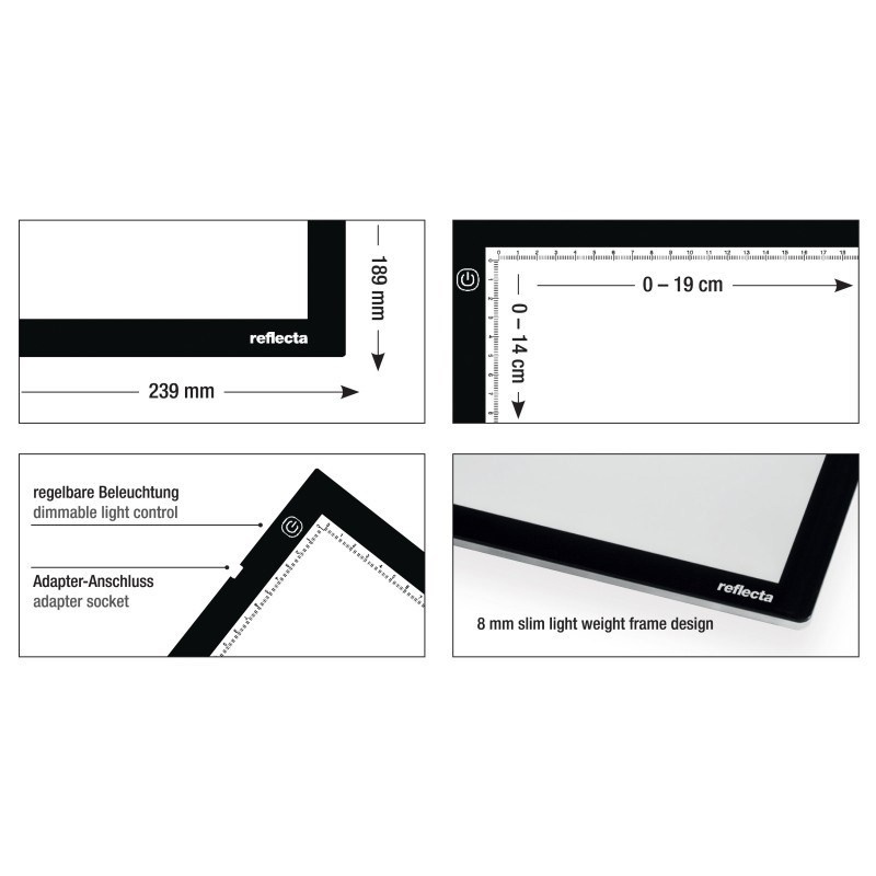 Prosvetlený panel s modernou technológiou SuperSlim LED, osvetľovacia plocha 19x14cm s mierkou v cm na okraji plochy, plynulá regulácia výkonu, dotykové ovládanie, sieťový zdroj AC/DC 12V/4,3W - 3,5mm Jack, životnosť LED 50.000h. Rozmery 23,9x18,9x0,8cm, hmotnosť 400g.