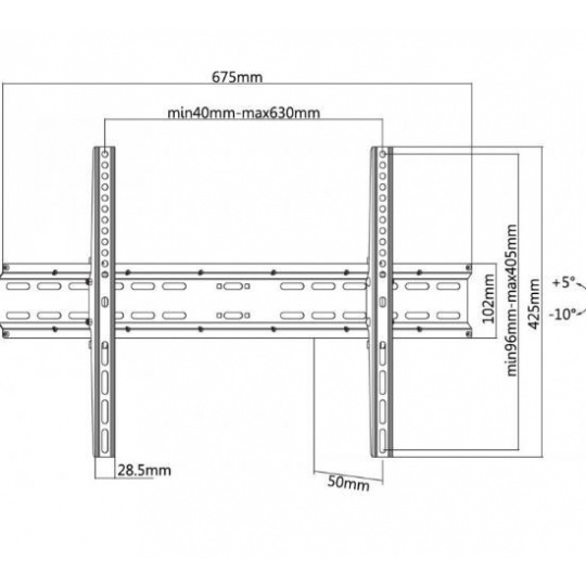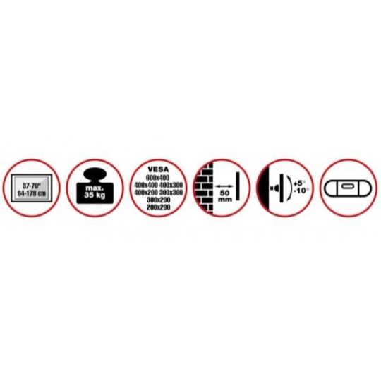 Nástenný oceľový držiak SLIM s minimálnou vzdialenosťou od steny na Plasma a LCD TV s uhlopriečkou 37"- 70" (94-178cm) a hmotnosťou maximálne 35kg. Stredová konzola na zavesenie TV s upevnenými držiakmi, vertikálne výklopný +5°/-10°, vzdialenosť od steny 50mm, materiál oceľ, farba čierna. Upevnenie VESA: 200x200, 300x200, 300x300, 400x200, 400x300, 400x400, 600x400.