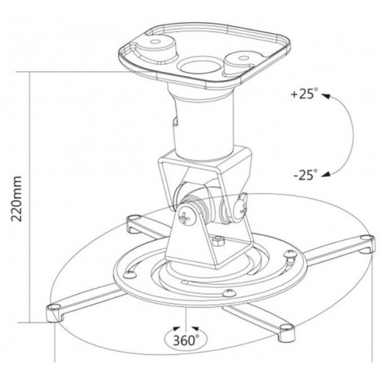 Stropný držiak na dátové projektory - vzdialenosť od stropu 22 cm, prístroj je možné otočiť o 360° a nakloniť +/-25°, maximálne zaťaženie 15 kg, káblový prechod, vhodné aj na uchytenie na šikmé plochy, biela. Univerzálny systém uchytenia dátových projektorov (rozsah 18-31 cm).