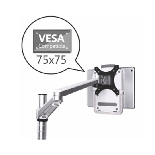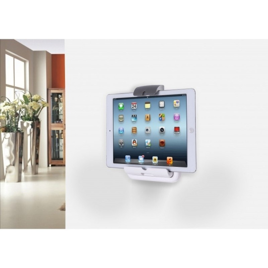 Tenký Slim stojánek pro tablety 7-10,1"/17-26cm max 1kg v horizontální i vertikální poloze na stůl, zeď a pomocí magnetů na kovovou plochu. VESA 75x75, 2x otvory pro uchycení vruty, fixace tabletu ze dvou stran, lehké plastové provedení pro transport, rozměry 19,7x14x3,6cm, šedý / bílý.