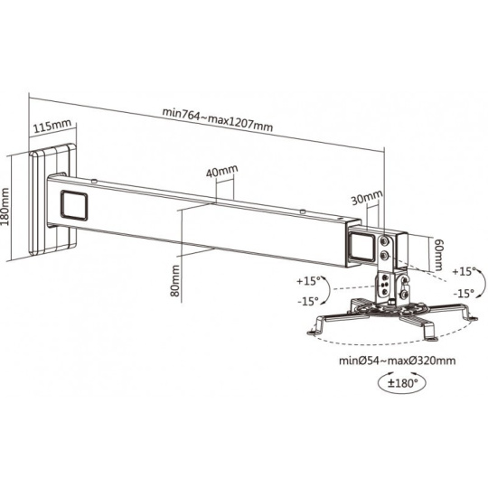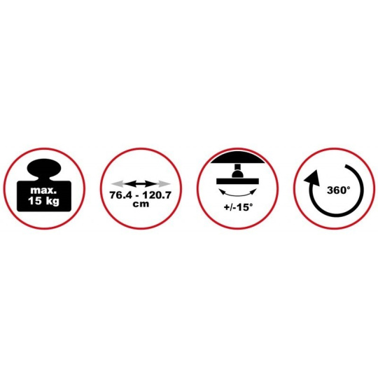 Nástenný držák na dataprojektory - vzdialenosť od steny 76-120 cm, prístroj je možné otáčať o 360° a nakloniť +/-15°, maximálna záťaž 15kg, kabelový prechod, biely. Univerzálny systém uchytenia dataprojektorov (rozsah 5,4-32 cm).