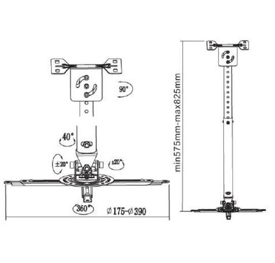 Stropný držiak na dataprojektory - vzdialenosť od stropu 57,5-82,5cm, prístroj je možné otočiť o 360° a nakloniť +/-20°, maximálne zaťaženie 20kg, možnosť naklopenia nosnej tyče - vhodné na šikmé plochy, strieborný. Univerzálny systém uchytenia dataprojektorov ( rozsah 16-33 cm ).
