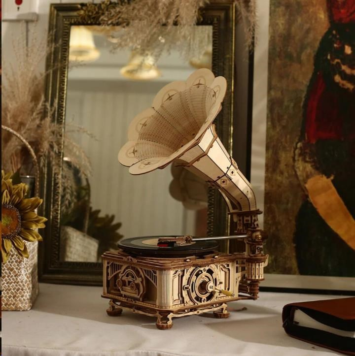 Aká je história? Stavebnica gramofónu z preglejky. Retro dizajnom, inšpirovaným gramofónom vynaloženým Thomasom Edisonem, Vás prenesie do 19. storočia. Nie je to len model, skutočne vie prehrávať platne a je k nemu tiež dodávaná 7" gramodeska obsahujúca trojicu piesní (The Merry Gent, Memory Of A Dance, The Giant Killers). zariadenie disponuje ručným, klikou, poháňaným mechanizmom a dynamom. Je možné ho však poháňať aj elektricky, pomocou vestaveného micro-USB konektora. Podporuje platne o rozmeroch 17,5 cm (7") a 25 cm (10") a všetky im zodpovedajúce rýchlosti prehrávania. Hlasitosť reprodukcie je možné upraviť pomocou otáčacieho ovládača. Jedinečný darček pre všetkých nadšencov kutilstva a hudby, ale aj luxusná interiérová dekorácia do izby či kancelárie. Skladačka je dodávaná v nesloženom stave, balená v krabici. Vybavená podrobným návodom na zostavenie.