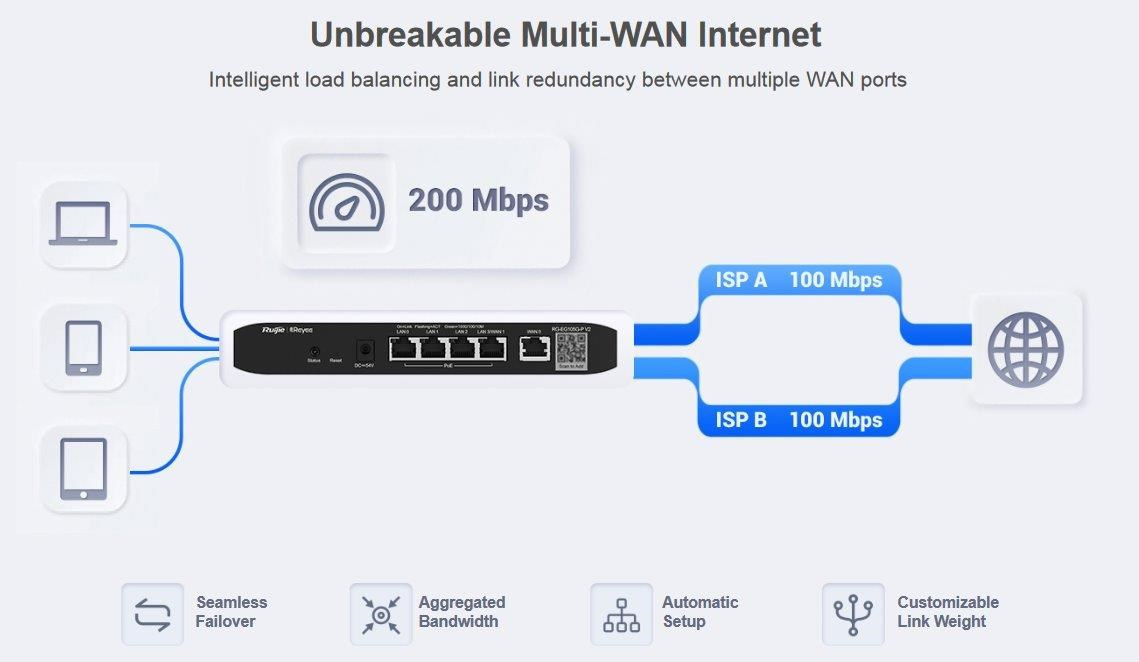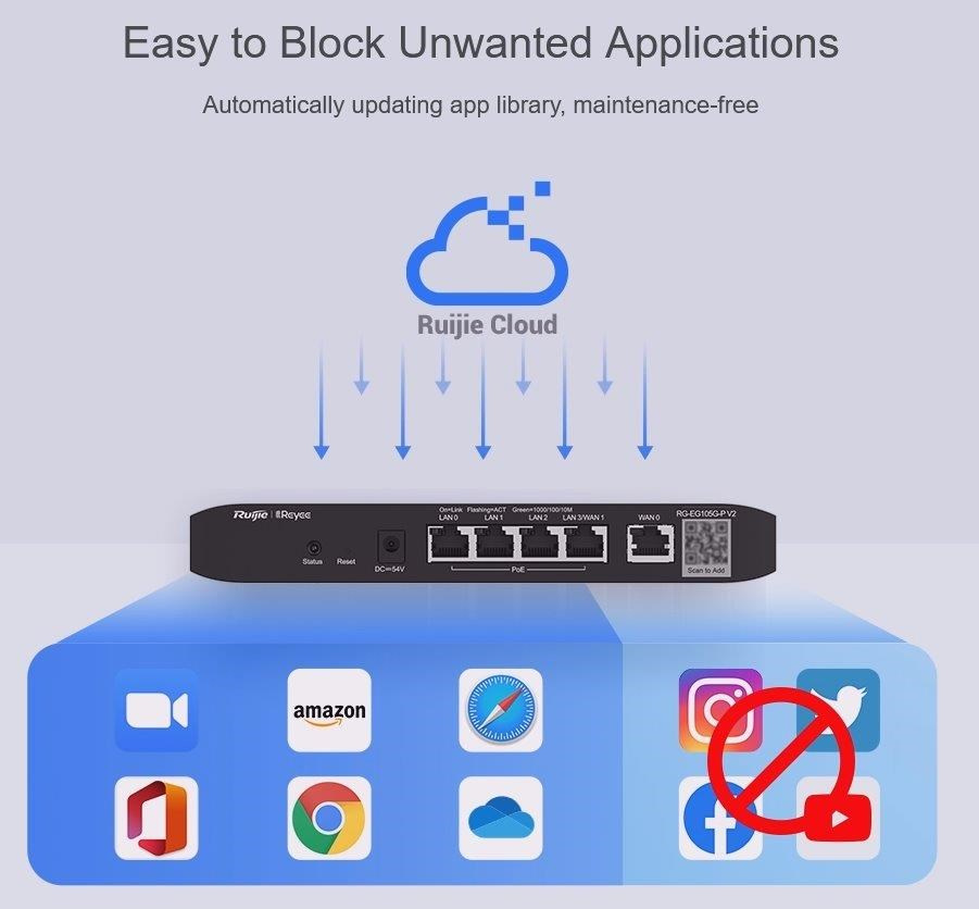 Popis produktu Ruijie RG-EG105G V2 je kabelový Gigabitový router s VPN vhodný do domácností i malých firem. Bezpečný a spolehlivý router s vlastním webovým managementem, možností správy přes Ruijie Cloud odkudkoliv a kdykoliv ale také blokováním obsahu na základě typu služeb z automaticky updatovaného seznamu nebo URL, inteligentní Multi-WAN load balancing a captive portál. Router disponuje 2 Gigabitovými WAN porty z čehož jeden je LAN/WAN, 3 Gigabitovými LAN porty a celkovým výkonem v NATu 600 Mbps. Router pro přístup do lokální sítě umožňuje nastavení i několika možností VPN serverů a to konkrétně: IPsec, PPTP, L2TP a OpenVPN. Obsah balení • Zařízení • Napájecí adaptér 12V Technické parametry Konektory a rozhraní Možnost více WAN:Ano Rychlost LAN:(3) 10/100/1000Mbps + (1) 10/100/1000Mbps LAN/WAN Gigabit LAN:Ano Napájení Typ napájení:DC konektor Max. spotřeba energie [W]:6 Napájení přes konektor/svorkovnici:12V DC Fyzické charakteristiky Provedení:Desktop Ventilátory:Bez ventilátoru Šasi:Kovové Tlačítka:Reset Provozní teplota [°C]:0 až 40 Šířka [mm]:207 Výška [mm]:28 Hloubka [mm]:109 Hardware CPU:Dual Core Frekvence CPU [MHz]:880 Počet CPU jader:2 RAM [MB]:128 Obecné Propustnost NAT [Mb/s]:600 Software Podporované VPN:PPTP, L2TP, IPSec, OpenVPN.
