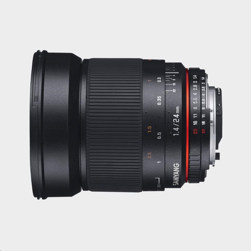 Samyang 24mm f/1.4 ED AS IF UMC is a fast, manually focused wide-angle lens compatible with full frame sensors. It is available in many mounts, including mirrorless cameras with APS-C or Micro Four Thirds sensors.