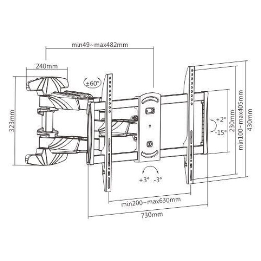 Profesionálny otočný držiak na televízory Fiber Super-3 Držiak na televízory 43-75", otáčanie do strán +/-60°, naklápanie +2°/-15°, korekcia roviny +/-3°, vzdialenosť Tv od steny 49-482mm, vedenie káblov, VESA 200x100 až 600x400, nosnosť 45kg Nástenný držiak vynikajúcej profesionálnej kvality a v krásnom dizajnovom prevedení, ktorý je ideálny na zavešenie televízie s uhlopriečkou 43" až 75". Držiak Vám umožní s televízorom otáčať na obe strany až o 60°, nakloniť ho hore +2° alebo dole až o -15°, upraviť jeho rovinu o +/-3° a meniť vzdialenosť od steny od 49mm až do 482mm. Držiak podporuje VESA štandardy pre zavešenie Tv 200x100 až 600x400 a zvláda maximálnu hmotnosť až 45kg. Celá konštrukcia je oceľová, nástenný úchyt a ramená držiaku sú opatrené dizajnovými krytmi so systémom pre vedenie káblov. V balení nájdete inštalačný materiál. Farebné prevedenie čierne, o kvalite a spoľahlivosti držiaka svedčí aj poskytovaná záruka 10 rokov. Profesionálny nástenný držiak na televízory Fiber Super-3 Technické údaje: nosnosť 45kg na televízory a monitory s uhlopriečkou 43" až 75" podporované veľkosti VESA štandardov 200x100 až 600x400 otáčanie televízora do strán +/- 60° naklápanie televízora nahor +2° a nadol až -15° nastavenie vzdialenosti od steny 49mm až 482mm korekcia roviny obrazovky +/- 3° dizajnové kryty so systémom pre vedenie káblov oceľová konštrukcia ľahká montáž a polohovanie televízora inštalačný materiál farebné prevedenie čierne záruka 10 rokov Ramená držiaka Fiber Super-3 sú opatrené dizajnovými krytmi so systémom pre vedenie káblov Držiak Tv Fiber Super-3 podporuje VESA štandardy: VESA 200x100 VESA 200x200 VESA 300x200 a 200x300 VESA 300x300 VESA 400x200 a 200x400 VESA 400x300 a 300x400 VESA 400x400 VESA 600x400 Na držiak Fiber Super-3 môžete zavesiť všetky typy a značky Tv aj monitorov, ktoré: majú maximálnu hmotnosť 45kg podporujú ktorýkoľvek z vyššie uvedených VESA štandardov