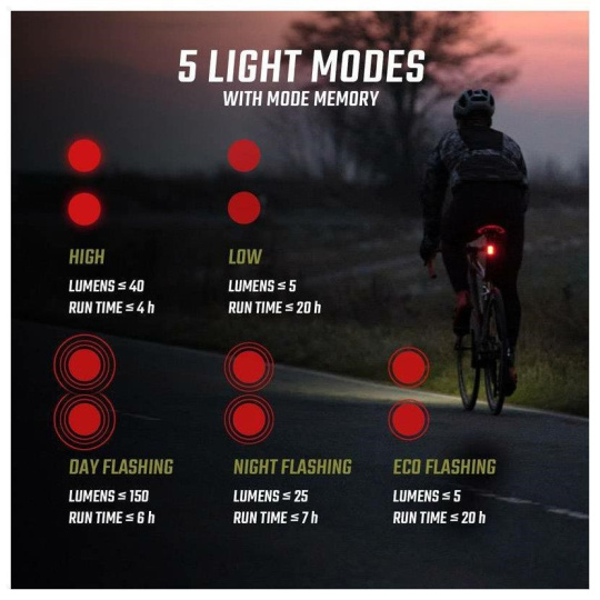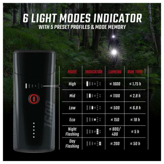 6 svetelných režimov: High (1600 lm), Mid (1100 lm), Low (500 lm), Eco (150 lm), Night Flashing (800/400 lm), Day Flashing (200 lm)