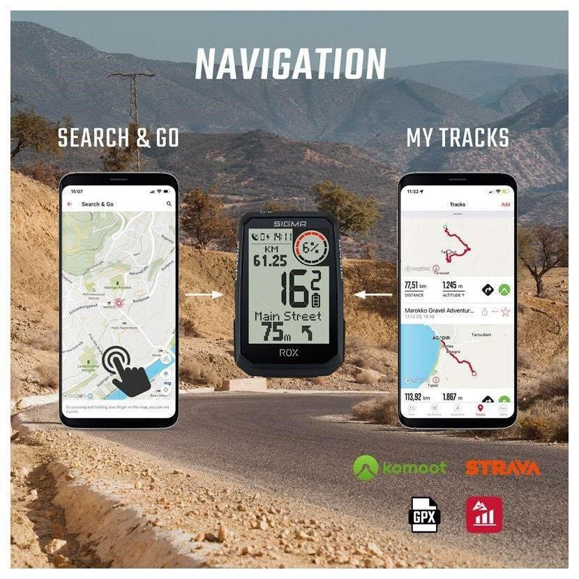 Počas navigácie sa na displeji ROX 4.0 Endurance zobrazuje trasa a pokyny na odbočku „Turn-by-Turn“. Odbočná šípka a akustický signál ukazujú ďalšiu odbočku. Aby ste odbočku nezmeškali, zariadenie ROX spoľahlivo naplánuje novú trasu do cieľa pomocou aktuálneho aktualizovaného výškového profilu, ak sa spontánne odkloníte od navrhnutej trasy. Názvy ulíc sa tiež zobrazujú. Ak sa náhle odklonite od navrhnutej trasy, zariadenie ROX vo spolupráci s aplikáciou SIGMA RIDE rýchlo naplánuje novú trasu do cieľa s príslušným aktualizovaným výškovým profilom.