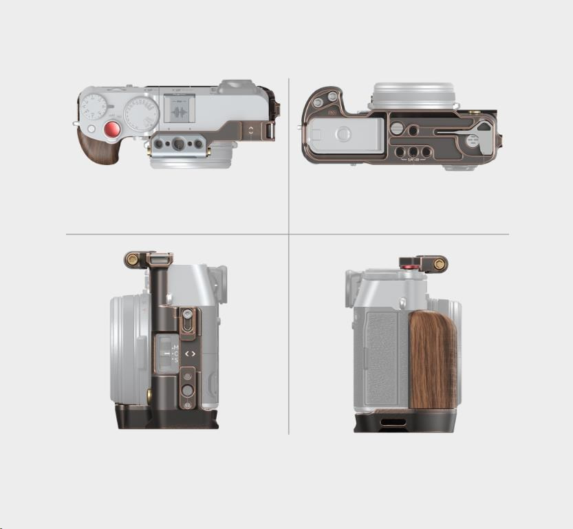 Klietka v retro štýle sa k fotoaparátu pripája pomocou skrutky 1/4"-20 na spodnej strane a jedného bočného zámku na ľavej strane a silikónové podložky zabraňujú poškriabaniu.