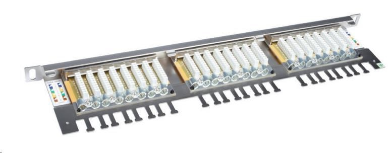 Vysokohustotný 0,5U tienený patch panel CAT6 s 24 portmi a viazacou lištou.