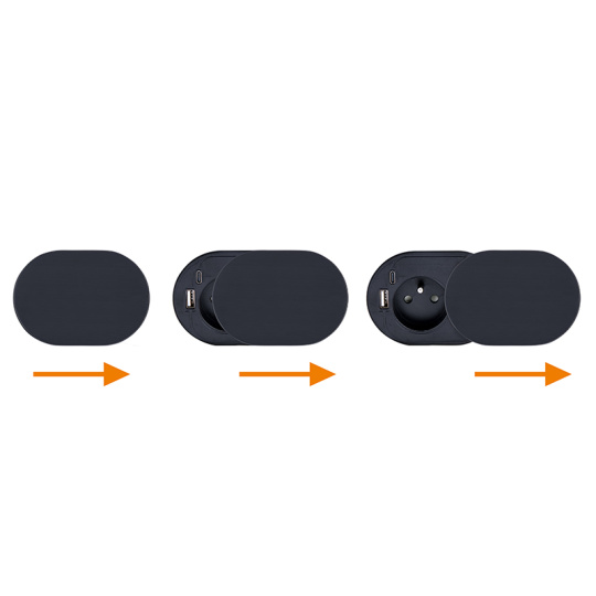 Posuvné viečko chráni zásuvky aj USB porty pred prachom, nečistotami alebo kapalinami a umožňuje zakryť iba časť, ktorú momentálne nepoužívate. Horný kryt z brúseného nerezového ocele v matnej čiernej úprave je nielen odolný, ale aj esteticky príjemný, takže zásuvka ľahko zapadne do akéhokoľvek interiéru.