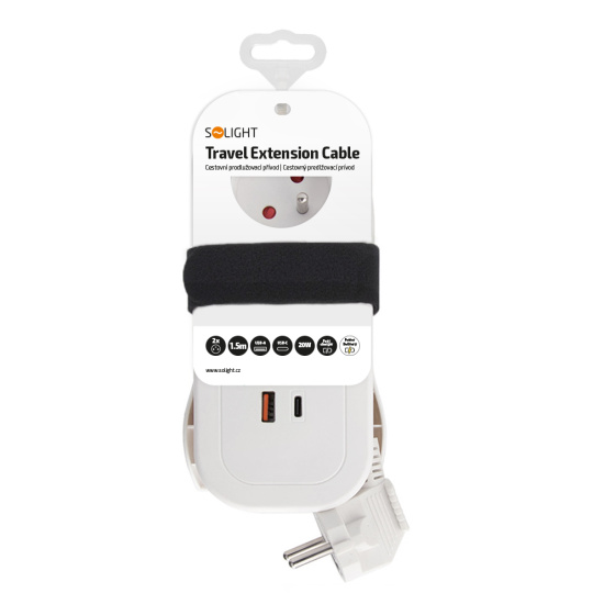 .Solight 2z + USB A+C 20W PD, cestovní prodlužovací přívod 1.5m, bílý