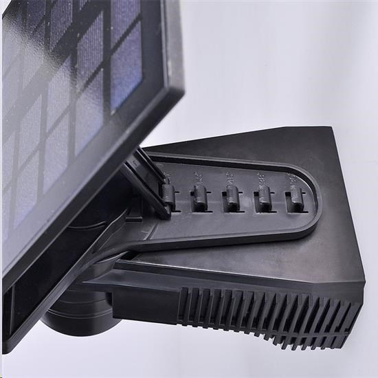 LED osvetlenie so solárnym panelom a nastaviteľným svetelným a pohybovým senzorom svetelné reflektory aj solárny panel možno horizontálne aj vertikálne natáčať a naklápať vhodné na osvetlenie vonkajších častí priestorov bez prívodu elektrickej energie (parkoviská, pergoly, kôlne, záhrady, vstupné brány a pod.) príkon: 8W svetelný tok: 600lm teplota svetla (chromatičnosť): 4000K (neutrálny biely) nastavenie času svietenia: cca 10s-60sek nastavenie svetelnej citlivosti: 10-1000lux uhol detekcie senzora: 110° detekčná vzdialenosť: cca 8m doba nabíjania batérie solárnym panelom: cca 8 hodín (v závislosti od svetelných podmienok) čistá doba svietenia: max. 1hod. batéria: 1x Li-Ion 3,7V 2000mAh vypínač: vypnuté (OFF) / automatické zapnutie (AUTO) farba: čierna