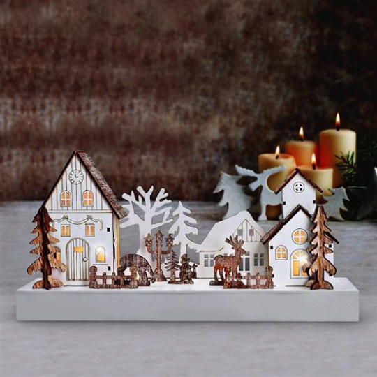 Solight LED vánoční vesnička, 34x17cm, dřevo, 4 LED, 2x AA
