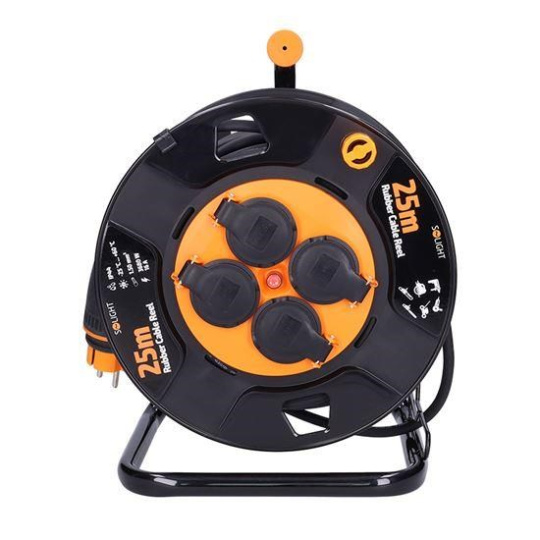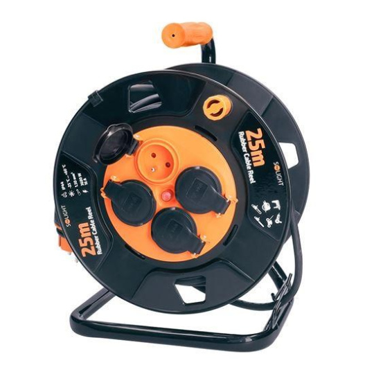 Solight prodlužovací přívod na bubnu, 4 zásuvky, venkovní, 25m gumový kabel, 3x 1,5mm2, IP44