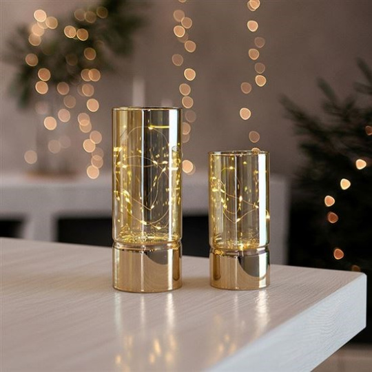 Sada obsahuje dvě skleněná světélka různých velikostí, vybavená LED diodami – menší se 10 diodami a větší s 20 diodami. Jemné světlo krásně prosvítá zlatým skleněným povrchem a vytváří působivý efekt. Díky praktickému časovači se světélka automaticky zapnou na 6 hodin a poté se na 18 hodin vypnou, což zajišťuje pohodlné a úsporné používání.