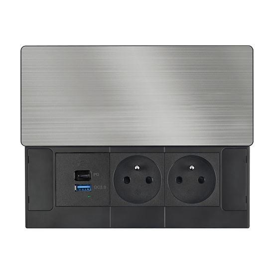 Vrchný kryt z matnej tmavej nerezovej ocele (inox) pôsobí elegantne a prirodzene zapadne do moderného interiéru. Nízky profil, čisté línie a nenápadné posuvné otváranie zachovávajú vzhľad pracovnej plochy. Zásuvky aj nabíjacie porty sú kedykoľvek ľahko prístupné jednoduchým pohybom ruky.