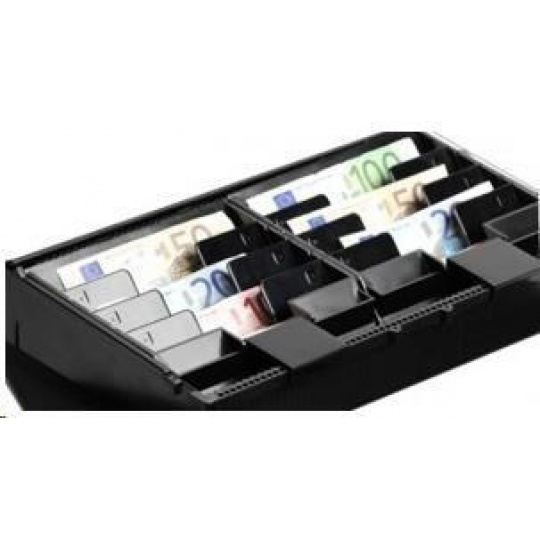 pokladničná zásuvka, otváranie spredu, rozmery (ŠxVxH): 410x114x415mm, 8 priehradiek na bankovky (vertikálne), 8 priehradiek na mince, 1 priehradka na účtenky, 3poz. zámok, priame pripojenie tlačiarne, farba: tmavosivá..
