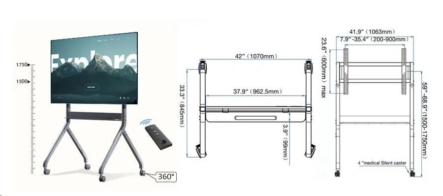 Kvalitný, veľmi pekný pojazdný televízny stojan s elektrickým pohonom na úpravu výšky obrazovky od 1500 mm do 1750 mm. Stojan má policu na príslušenstvo 962x99 mm s integrovaným ovládacím panelom, 4 otočné pojazdové kolieska s aretáciou a držiak TV s podporou VESA 200x200 až 900x600. Súčasťou balenia je aj diaľkové ovládanie. Vynikajúca oceľová konštrukcia s nosnosťou 90,9 kg zabezpečuje vynikajúcu pevnosť, stabilitu a odolnosť. Na stojan poskytujeme záruku 3 roky. Stojan na interaktívnu tabuľu / televízor / dotykovú obrazovku / monitor NB P220 Popis: Univerzálny mobilný stojan pre stredne veľké a veľké obrazovky Perfektné riešenie pre interaktívne tabuľe a multimediálne obrazovky Široká, stabilná základňa s ľahkým prístupom k dotykovým obrazovkám Elektrické nastavenie výšky obrazovky Kvalitné materiály, veľmi pevná a odolná konštrukcia Polica na príslušenstvo s ovládacím panelom Podpora štandardu VESA Jednoduchá a rýchla montáž Ideálne do konferenčných miestností, škôl, na výstavy, prezentácie, prednášky alebo na súkromné použitie Štyri otočné kolieska s funkciou aretácie Vysoká nosnosť, skvelá stabilita, tichý a spoľahlivý motor Farebné prevedenie grafit Elektrický stojan na multimediálne tabule a multimediálne dotykové monitory NB P220 Technické údaje: Nosnosť 90,9 kg Pre obrazovky 60" - 100" Podpora VESA štandardov 200x200 až 900x600 Výškové nastavenie v rozsahu 150 ~ 175 cm Otočné kolieska s priemerom 75 mm s funkciou aretácie Pevná oceľová konštrukcia Spodná polica na príslušenstvo s ovládacím panelom, rozmery: 962 x 99 mm Dálkové ovládanie Výkonný motor 75W Napájanie 240V / 110V Povrchová úprava: práškový náter Farba: grafitová Záruka 3 roky