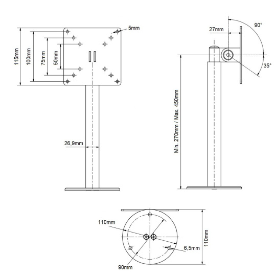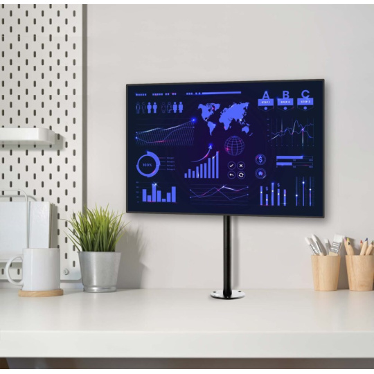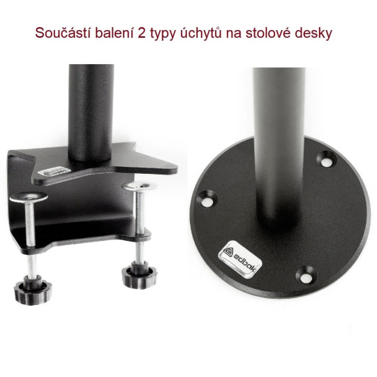 Stolný držiak na dotykové monitory EDBAK SV30    Držiak na TV a monitory 15-43", nastaviteľná výška 280-450mm, nastavenie náklonu -30°/+90°, otáčanie do strán +/-180°, 2 typy stolových uchýtov, VESA 75x75 a 100x100, nosnosť 10kg    Stolný držiak pre monitory a televízie 15-43", ktorý vyniká svojou vynikajúcou kvalitou, nastaviteľnosťou a aretáciou obrazovky v nastavenej polohe. Nastaviteľná výška v rozmedzí 28-45cm od stolovej dosky, otočenie do strany +/- 180°, naklápanie v širokom rozsahu od -30° až do +90° (obrazovka vodorovne). Držiak je dodávaný so 2 typmi stolového uchytenia - svorka pre uchytenie na okraje stolov a hliníková skruž s otvormi na ukotvenie do stolovej dosky. Držiak podporuje VESA štandardy 75x75 a 100x100 a má nosnosť 10kg. Vďaka pevnej konštrukcii a aretácii polohy je držiak vhodný nielen na monitory a televízie, ale aj na dotykové obrazovky. Záruka 5 rokov.      Stolný držiak na monitory EDBAK SV30    Technické údaje:  nosnosť 10kg vhodný pre monitory, televízie a dotykové obrazovky 15" - 43" podporuje VESA štandardy 75x75 a 100x100 nastaviteľná výška 280 až 450mm otočný +/- 360° sklopný +90°/-30° voľba vhodného typu uchytenia na stolovú dosku - na okraj alebo do priestoru fixácia v požadovanej polohe ľahká inštalácia farebné vyhotovenie čierne záruka 5 rokov    Stolné držiaky na monitory alebo televízie Edbak SV30    Držiak podporuje VESA štandardy na uchytenie monitorov:  VESA 75x75 VESA 100x100    Na držiaky EDBAK SV30 je možné zavesiť všetky monitory a televízory, ktorých hmotnosť je maximálne 10kg a ktoré podporujú niektorý z vyššie uvedených VESA štandardov. Výška televízie alebo monitora (nie uhlopriečka) nesmie byť väčšia ako 36cm.
