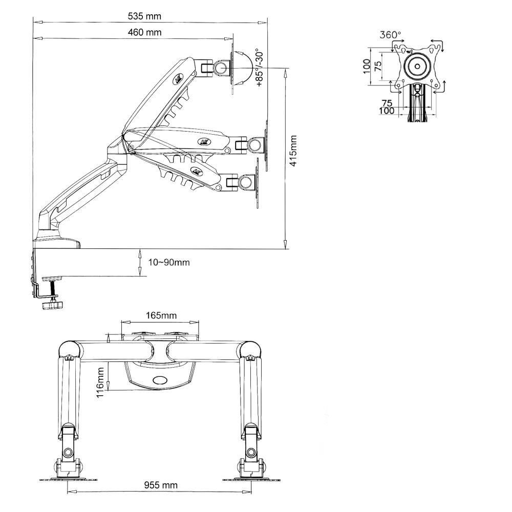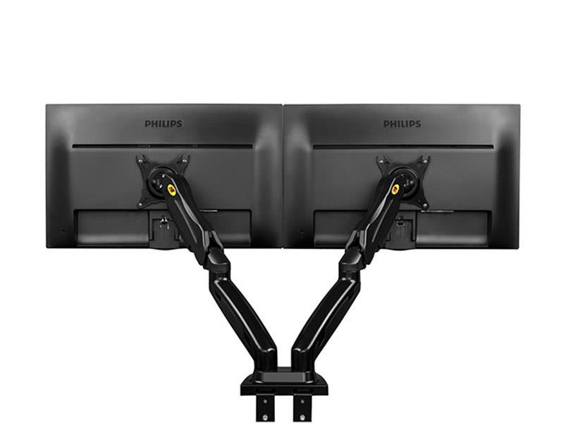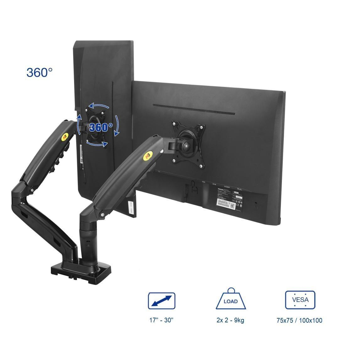Stolný držiak na 2 monitory displeja NB F160 Stolný držiak na zavesenie 2 monitorov 17-30", nezávislé nastavenie každého monitora, výškové polohovanie 140-400mm, otáčanie do strán +/-180°, naklápanie +85°/-30°, vzdialenosť od uchopovacieho bodu 0-530mm, pivot +/-360°, VESA 75x75 a 100x100, nosnosť 18kg Vynikajúci stolný držiak na monitory a menšie televízory v profesionálnej kvalite, s pekným dizajnom, s množstvom nadštandardných možností nastavenia. Otáčanie obrazovky do strán, naklonenie nahor aj nadol vo vysokom uhle, nastavenie vzdialenosti od uchytenia, korekcia roviny obrazovky, horizontálne alebo vertikálne otočenie obrazovky, systém skrytého vedenia káblov. Výškové nastavenie až 400mm, výšková regulácia 260mm - veľmi jednoduchá manipulácia. Všetko v unikátnom dizajne. Držiak má veľmi odolnú a bezpečnú konštrukciu a je vhodný aj do veľmi vytížených prevádzok, kde je potrebná neustála manipulácia. Stolný držiak na 2 monitory NB F160 NB F160 kvalitný dvojmonitorový držiak na stôl, polohovateľný Držiak je vďaka možnosti úplnej nastaviteľnosti, profesionálnej konštrukcii a peknému dizajnu vhodný pre veľmi široké spektrum využitia. Odporúčame ako do domácností, tak kancelárií, pracovní, školských tried, nemocníc, call centier, IT pracovísk, prevádzok a firiem. Stolný multimonitorový držiak NB F160 - nezávislé zavesenie 2 monitorov na stolný držiakKancelársky stolný držiak na 2 PC monitory v TOP kvalite a dizajne - NB F160 Technické údaje: nosnosť 18kg podporuje VESA štandardy 75x75 a 100x100 odporúčame na monitory a televízory s uhlopriečkou 17" až 30" otáčanie na obe strany +180° až -180° nastavenie výšky monitorov 140-400mm naklonenie monitorov +85°/-30° vzdialenosť od stolového uchytenia 0-530mm horizontálne aj vertikálne otočenie obrazovky - funkcia pivot +/-360° systém pre vedenie káblov profesionálny držiak vyššej kvality 2 typy uchytenia na stolovú dosku - na okraj alebo skrz stolovú dosku 10-90mm záruka 5 rokov Kancelársky držiak na dva monitory NB F160 Kvalitný polohovací držiak na monitory do kancelárie NB F160