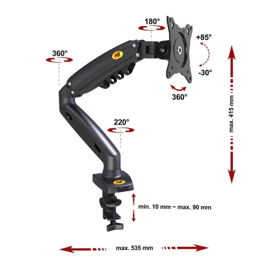Stolový kancelársky držiak monitora NB F80B    Profesionálny držiak monitorov 17-30", plne nastaviteľný, krásny dizajn, VESA 75x75 a 100x100, výškové polohovanie, nosnosť 9kg    Vynikajúci stolový držiak na monitory, prípadne menšie televízory 17-30" v profesionálnej kvalite, s pekným dizajnom a s mnohými nadštandardnými možnosťami nastavenia. Otáčanie obrazovky do strán, náklon nahor aj nadol v širokom rozmedzí, nastavenie vzdialenosti od uchytenia až 535mm, korekcia roviny obrazovky, horizontálne alebo vertikálne otočenie obrazovky pivot, systém pre skryté vedenie káblov. Výškové nastavenie obrazovky v rozmedzí až 260mm vďaka plynovému piestu - veľmi jednoduchá zmena výšky iba stlačením alebo vytlačením monitoru. To všetko v jedinečnom dizajne. Držiak má veľmi odolnú a bezpečnú konštrukciu a je vhodný aj do veľmi vyťažených prevádzok, kde je potrebná neustála manipulácia s monitorom.     Stolový držiak monitora do kancelárie, prevádzky alebo domácnosti - držiak NB F80B     Technické údaje:  nosnosť 9kg (minimálna hmotnosť obrazovky 2kg) podporuje VESA štandardy 75x75 a 100x100 odporúčame na monitory a televízory s uhlopriečkou 17" až 30" otáčanie na obe strany +135° až -135° výšková regulácia v rozmedzí 260mm maximálna výška 415mm veľká uhlová nastaviteľnosť náklonu +85° až -30° regulácia vzdialenosti od uchytenia na stole 0mm až 535mm horizontálne aj vertikálne otočenie obrazovky funkciou pivot korekcia roviny obrazovky veľmi jednoduchá nastaviteľnosť jediným prstom systém pre skryté vedenie káblov profesionálny držiak vysokej kvality, odolná a bezpečná konštrukcia vhodný aj pre každodenné polohovanie monitora 2 typy uchytenia na stolovú dosku (na okraj alebo do priestoru cez otvor) záruka 3 roky      Stolový držiak na monitor s úplným polohovaním NB F80B    Kancelársky stolový držiak NB F80B podporuje VESA štandardy:  VESA 75x75 VESA 100x100 možnosť rozšírenia na 200x100 za príplatok možnosť rozšírenia na 200x200 za príplatok    Stolový držiak do kancelárií v najvyššej kvalite a krásnom dizajne, široká škála polohovania NB F80B    Vďaka profesionálnej kvalite, odolnej konštrukcii, plnej nastaviteľnosti a peknému dizajnu je držiak vhodný:  domácnosti, detské izby pracovne, kancelárie, prevádzky, obchody štátne inštitúcie - školstvo, nemocnice, zasadacie sály, prezentačné priestory, konferenčné sály firem a podnikov    Stolový držiak na monitor NB F80B je možné použiť aj na väčšie monitory než 30", podmienkou je maximálna hmotnosť 9kg a podpora VESA štandardu 75x75 a 100x100 (za príplatok je možné zakúpiť aj rozšírenie na 200x100 a 200x200). U monitorov a televízorov s uhlopriečkou nad 30" už nebude možné vertikálne otočenie obrazovky, iba horizontálne.