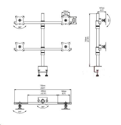 Technické údaje: < “maximálne celkové zaťaženie 40kg” > < “na monitory s uhlopriečkou až 30” > < “podporuje VESA štandard 75x75 a 100x100” > < “posun monitora po osi držiaka” > < “nastaviteľná výška oboch súprav monitorov” > < “sklon monitoru až 160st.” > < “otáčanie do strán až 70st.” > < “funkcia pivot - horizontálne aj vertikálne natočenie obrazovky” > < “dodávame vrátane 2 typov uchytenia na stolovú dosku” > < “uchytenie na stolovú dosku o sile 10-70mm” > < “farba strieborná alebo čierna” > < “záruka 5 rokov” > < “Profesionálne stolové držiaky na 4 monitory EDBAK podporujú VESA štandardy:” > < “VESA 75x75” > < “VESA 100x100” > < “možnosť dokúpenia VESA 200x100” > < “možnosť dokúpenia VESA 200x200” >