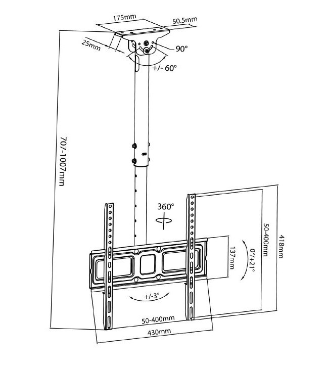 Stropný výsuvný držiak na TV Fiber Mounts M9C43 Stropný (stenný) držiak na TV 32-60", nastaviteľná dĺžka 717-1017mm, naklápanie 0-21°, VESA 75x75 až 400x400, nosnosť 35kg Kvalitný stropný držiak na televízie alebo monitory s uhlopriečkou 32-60". Držiak má nastaviteľnú dĺžku od 717mm do 1017mm, umožňuje otáčanie a naklápanie TV, upevnenie je možné na rovné aj šikmé stropy (alebo podkrovky), prípadne aj na stenu alebo bok stropného trámu - stropný úchyt je variabilný a umožňuje veľké uhlové polohovanie. Všetky káble môžete ľahko ukryť do tela držiaka. Podpora VESA 75*75 až 400*400, nosnosť 35kg. Materiál oceľ, dodávané vrátane montážneho materiálu. Kvalitný ale dostupný stropný držiak na TV 32-60" s nastaviteľnou dĺžkou, otáčateľný a sklopný Fiber Mounts M9C43 Technické údaje: - nosnosť 35kg - podpora VESA štandardov 75*75 až 400*400 - vhodný na televízie aj monitory s uhlopriečkou 32-60" - nastaviteľná dĺžka držiaka 717-1017mm - naklápanie 0° až 21° - korekcia roviny +/- 3° - otáčanie +/- 180° - uchytenie na rovné alebo šikmé stropy, na steny alebo zvislé povrchy - systém pre skryté vedenie káblov - materiál oceľ - montážny materiál - farebné prevedenie čierne - záruka 5 rokov Uhlovo polohovateľný úchyt stropného držiaka TV Fiber Mounts M9C43 Držiak podporuje VESA štandardy: - VESA 75*75 - VESA 100*100 - VESA 200*100 a 100*200 - VESA 200*200 - VESA 300*200 a 200*300 - VESA 300*300 - VESA 400*200 a 200*400 - VESA 400*300 a 300*400 - VESA 400*400