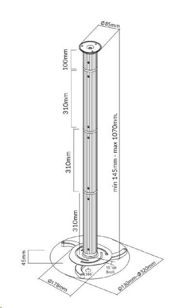 Kompletná špecifikácia Stropný držiak projektora Fiber Mounts M5C17 Dĺžkovo nastaviteľný, otočný, sklopný držiak projektora na strop, strieborný, nosnosť 10kg, univerzálny na všetky bežne dostupné projektory Stropný držiak projektora s nastaviteľnými vzdialenosťami od stropu Fiber Mounts M5C17 Univerzálny, kvalitný polohovací držiak na stropné zavedenie projektorov a dataprojektorov. Držiak je vhodný na 99% všetkých dostupných projektorov. Súčasťou balenia sú dĺžkové nástavce, vďaka ktorým je projektor možné zavesiť od stropu v dĺžke od 13 až do 106cm, nakloniť o 15° a otáčať do strán. Držiak je vyrobený z hliníku. Farebné prevedenie strieborné. Držiak pre stropné upevnenie projektora Fiber Mounts M5C17 Technické údaje: nosnosť 10kg univerzálny, vhodný na 99% bežne dostupných projektorov náklon +/- 15° natočenie do stan +/- 360° nastaviteľná dĺžka od stropu 13, 39, 70 alebo 106cm farba strieborná hliníková konštrukcia záruka 2 roky