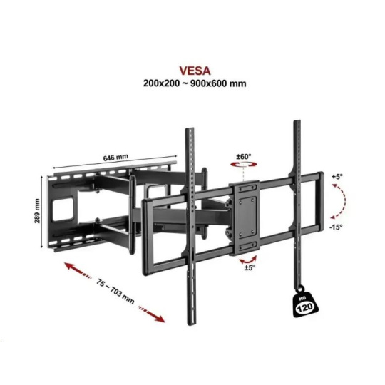 Super pevný TV držiak Fiber Novelty MEGA120 Držiak na TV 55" - 120", otočný +60° / -60°, sklopný +5° / -15°, vzdialenosť od steny 75 - 703mm, korekcia roviny +5° / -5°, inštalačný materiál, šablóna aj minivodováha, VESA štandardy 200x200 až 900x600, nosnosť 120kg Predstavujeme Fiber Novelty MEGA120, revolučný držiak na televízie, ktorý prináša neuveriteľnú flexibilitu a bezpečnosť pre vašu domácu zábavu. S možnosťou inštalácie televízorov od 55" až do neuveriteľných 120", tento držiak je navrhnutý tak, aby vyhovoval širokej škále potrieb a preferencií. Jeho robustná konštrukcia zabezpečuje, že váš televízor bude v bezpečí a stabilný, zatiaľ čo unikátny otočný a sklopný mechanizmus ponúka široké možnosti pre nastavenie optimálneho pozorovacieho uhla. MEGA120 držiak na televízie s nosnosťou 120kg a VESA 200x200 až 900x600 Fiber Novelty MEGA120 je vyrobený s ohľadom na najvyššie štandardy kvality a starostlivo vybraný inštalačný materiál zabezpečuje jednoduchú a rýchlu inštaláciu. Vďaka širokému rozsahu VESA kompatibility od 200x200 po 900x600 je tento držiak ideálnou voľbou pre takmer každý televízor na trhu. Navyše s nosnosťou až 120kg môžete byť istí, že váš televízor je v bezpečí. Využite plný potenciál svojho televízora s Fiber Novelty MEGA120 a premeňte svoj obývač na ultimátne centrum domácej zábavy. Či už sledujete svoj obľúbený film, deti si užívajú kreslené, alebo hostíte športový večer s priateľmi, tento držiak sa postará o nezabudnuteľný zážitok pre všetkých. Profesionálny extrémne pevný držiak na veľké televízie MEGA120 Technické údaje: nosnosť 120 kg na televízie, monitory a displeje s uhlopriečkou 55" - 120" podporované VESA štandardy 200x200 až 900x600 nastavenie vzdialenosti od steny 75 - 703mm otočenie do strán až +60° / -60° naklonenie obrazovky +5° / -15° korekcia roviny +5° / -5° výnimočne pevná konštrukcia úchytky na káble inštalačný materiál a šablóna, minivodováha hmotnosť samotného držiaka (bez TV) cca. 15kg farebné prevedenie čierne záruka 3 roky Nastaviteľná vzdialenosť od steny od 75 do 703 mm na držiaku TV MEGA120 Držiak TV MEGA120 podporuje tieto VESA štandardy: VESA 200x200 VESA 300x200 a 200x300 VESA 300x300 VESA 400x200 a 200x400 VESA 400x300 a 300x400 VESA 400x400 VESA 600x400 a 400x600 VESA 600x600 VESA 800x400 VESA 800x600 VESA 900x500 VESA 900x600