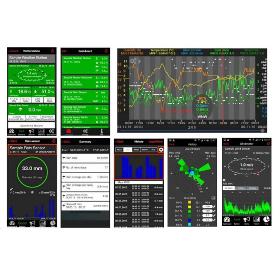 Meteorologická súprava umožňuje merať teplotu, relatívnu vlhkosť, zrážky a rýchlosť a smer vetra pomocou bezdrôtových senzorov a prenášať namerané údaje cez bránu a cez smerovač na internet. Na svojom mobilnom zariadení so systémom iOS 7 a novším alebo Android 3.2 a novším môžete na sledovanie nameraných údajov použiť aplikáciu MOBILE-ALERTS. Je možné pridať aj ďalšie bezdrôtové senzory, kde maximálny počet senzorov, ktoré je možné do brány zaznamenať, je 50.