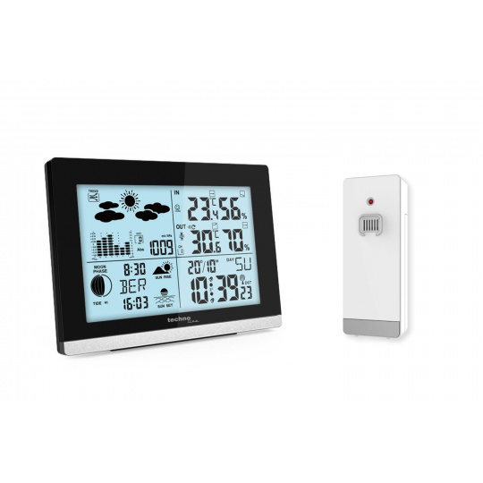 - veľkosť číslic na displeji – čas 17 mm, dátum, skratka názvu dňa 9 mm, vnútorná a vonkajšia teplota a vlhkosť 15 mm, barometrický tlak 9 mm, skratka názvu mesta 8 mm, čas východu a západu Slnka 7 mm