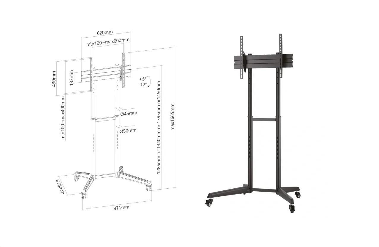 Tv stojan s kolieskami, nastavením výšky a náklonu, na televízie 37" - 70", výška 1285 / 1340 / 1395 / 1450 mm, náklon +5° / -12°, kolieska s aretáciou, podstava 871x678 mm, systém pre vedenie káblov, inštalačný materiál, podporuje štandardy VESA 100x100 až 600x400, nosnosť 50 kg Kvalitný stojan na televízie a monitory s naklápateľnými kolieskami a nastavením výšky Fiber Mounts LUTAR-1 Potrebujete dať televíziu alebo monitor na pojazdný stojan a nechcete míňať veľa peňazí? Chcete mať možnosť upraviť si výšku obrazovky a zmeniť uhol sklonu? Tak v tom prípade pre vás máme skvelé riešenie: televízny stojan Fiber Mounts LUTAR-1, ktorý splní všetko na 100%. Pojazdný stojan s kvalitnými kolieskami s aretáciou, s výbornou stabilitou, ktorý podporuje štandardy VESA od 100x100 do 600x400 a spoľahlivo unesie zariadenie s hmotnosťou až 50 kg vám umožní upraviť výšku aj náklon obrazovky. Konštrukcia umožňuje skryté vedenie káblov. Kvalitná vypalovaná čierna farba. V balení nájdete montážny materiál. Na stojan poskytujeme záruku 5 rokov. Pojazdný stojan s nastavením výšky a náklonu TV / monitoru Fiber Mounts LUTAR-1 Technické údaje: nosnosť 50 kg podpora VESA 100x100 až 600x400 držiak na televízie / monitory 37" - 70" nastaviteľná výška 1285 mm / 1340 mm / 1395 mm / 1450 mm nastavenie náklonu obrazovky +5° / -12° podstava 871x678 mm pojezdové kolieska s aretáciou systém pre skryté vedenie káblov kvalitná konštrukcia farebné vyhotovenie čierne záruka 5 rokov