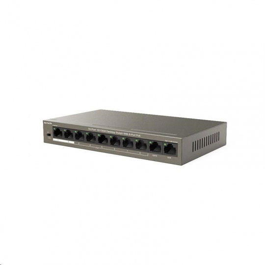 - Porty: 8x 10/100Mbps RJ45 s automatickým vyjednávaním, Port1 až Port8 podporuje IEEE802.3 štandardné porty PoE at/af + 2x 10/100Mbps pre Uplink