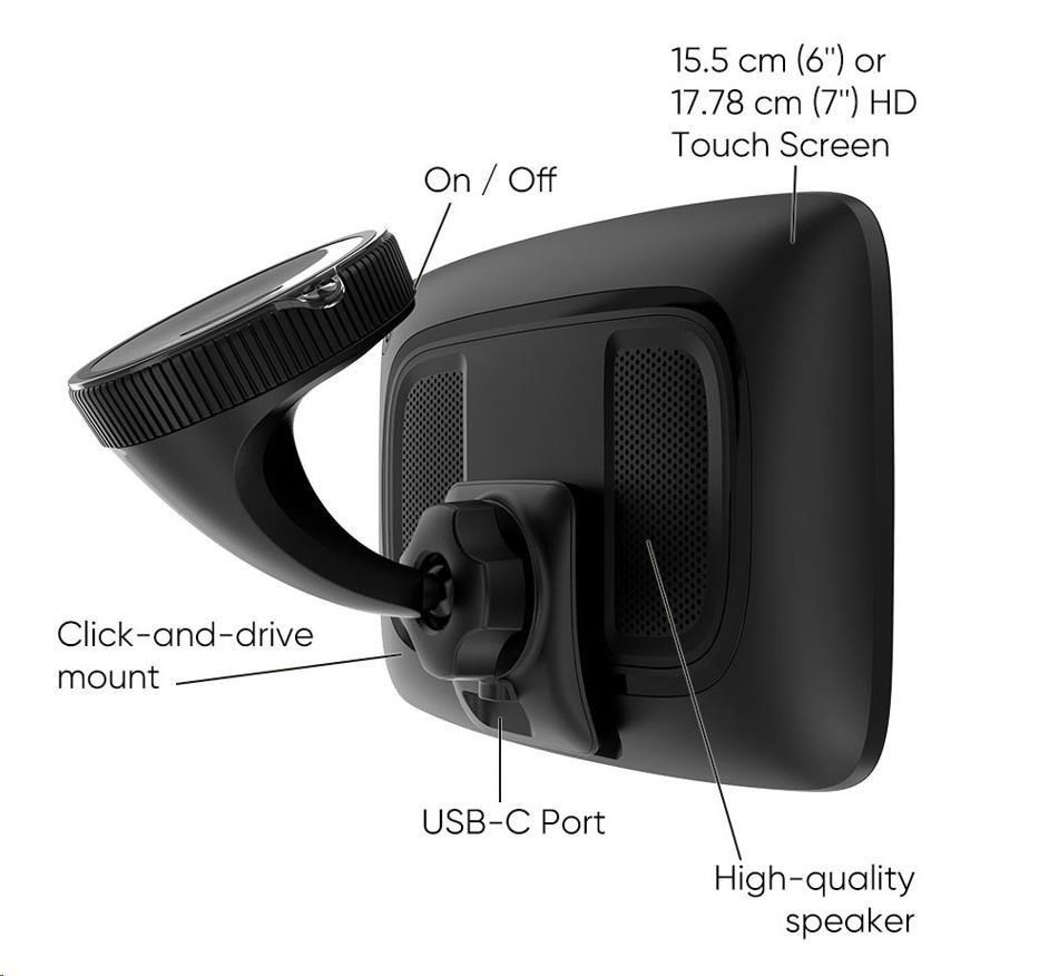 Prezrite si svoju trasu vo veľmi vysokých detailoch na 6" / 7" dotykovej obrazovke, ktorá sa môže pochváliť najlepším rozlíšením na trhu. A vďaka ovládaniu pomocou hlasových príkazov môžete zariadenie TomTom GO Superior ovládať bez toho, aby ste mali ruky na volante. Jednoducho použiteľný držiak Click-and-Drive navyše udrží navigačné zariadenie bezpečne na mieste.