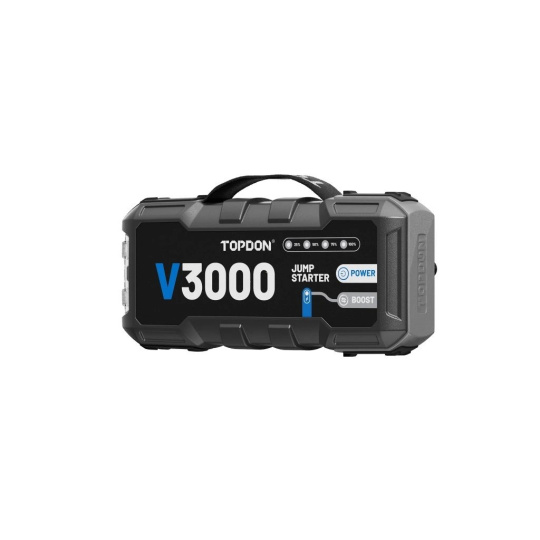 Startovací zdroj TOPDON V3000 je výkonově silný startovací booster a powerbanka v jednom je navržen pro náročné podmínky a vozidla s 12 V systémem (osobní auta, SUV, pick-upy, menší nákladní vozidla). Disponuje špičkovým proudem až 3000 A, díky čemuž spolehlivě nastartuje benzínové motory až 9,0 l a naftové až 7,0 l.