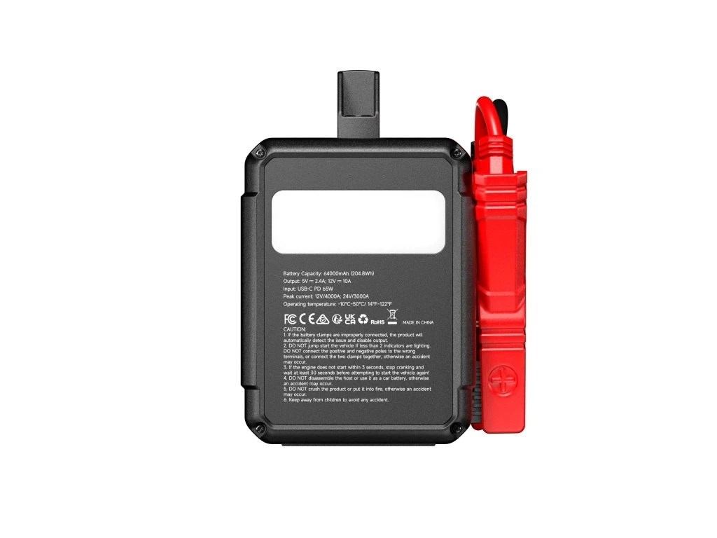 V4000 HD s bezpečnou LiFePO4 baterie s kapacitou 64 000 mAh (204,8 Wh). Ta poskytuje dostatek energie pro opakované starty – až 60 startů u 12V vozidel nebo 30 startů u 24V systémů na jedno nabití.