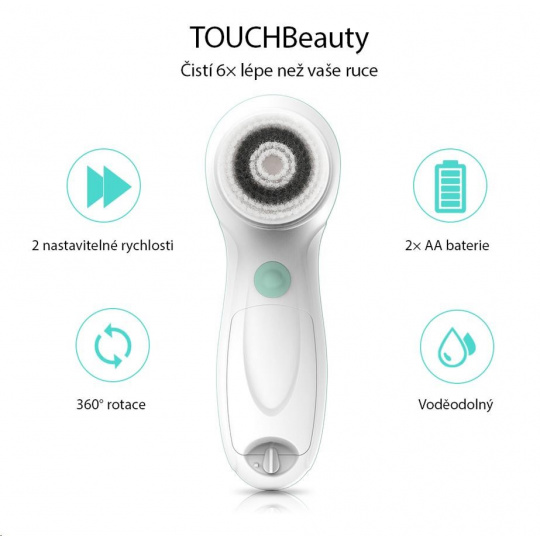Elektrická čistiaca kefka TOUCHBeauty 0759 ponúka tri rôzne nástavce, ktoré odstraňujú make-up, hĺbkovo čistia pleť a pomáhajú s peelingom. Dve pracovné rýchlosti a veľká ergonomická rukoväť zaisťujú maximálny komfort pri každodennom používaní. Vďaka vodoodolnému prevedeniu je čistenie prístroja hračkou. Praktické puzdro sa hodí nielen pre ukladanie prístroje a nástavcov, ale aj pre cestovanie.