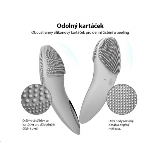 Každodenná čistiace plocha je vybavená jemnými silikónovými dotykovými bodmi, ktoré čistia tvár bez poškodenia pokožky.