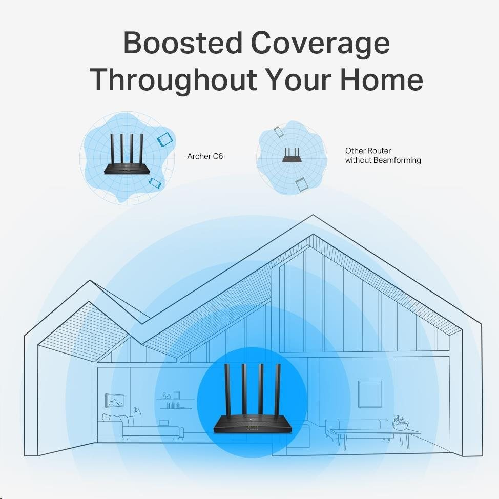 Router Archer C6 vytvára spoľahlivú a rýchlu sieť s technológiou Wi-Fi 802.11ac. Pásmo 2,4 GHz poskytuje rýchlosť až 300 Mbit/s, ktorá je pripravená na každodenné úlohy, ako je odosielanie e-mailov a prehliadanie webu, zatiaľ čo pásmo 5 GHz poskytuje rýchlosť až 867 Mbit/s, čo je ideálne na streamovanie HD videa a hranie online hier bez zpoždenia.