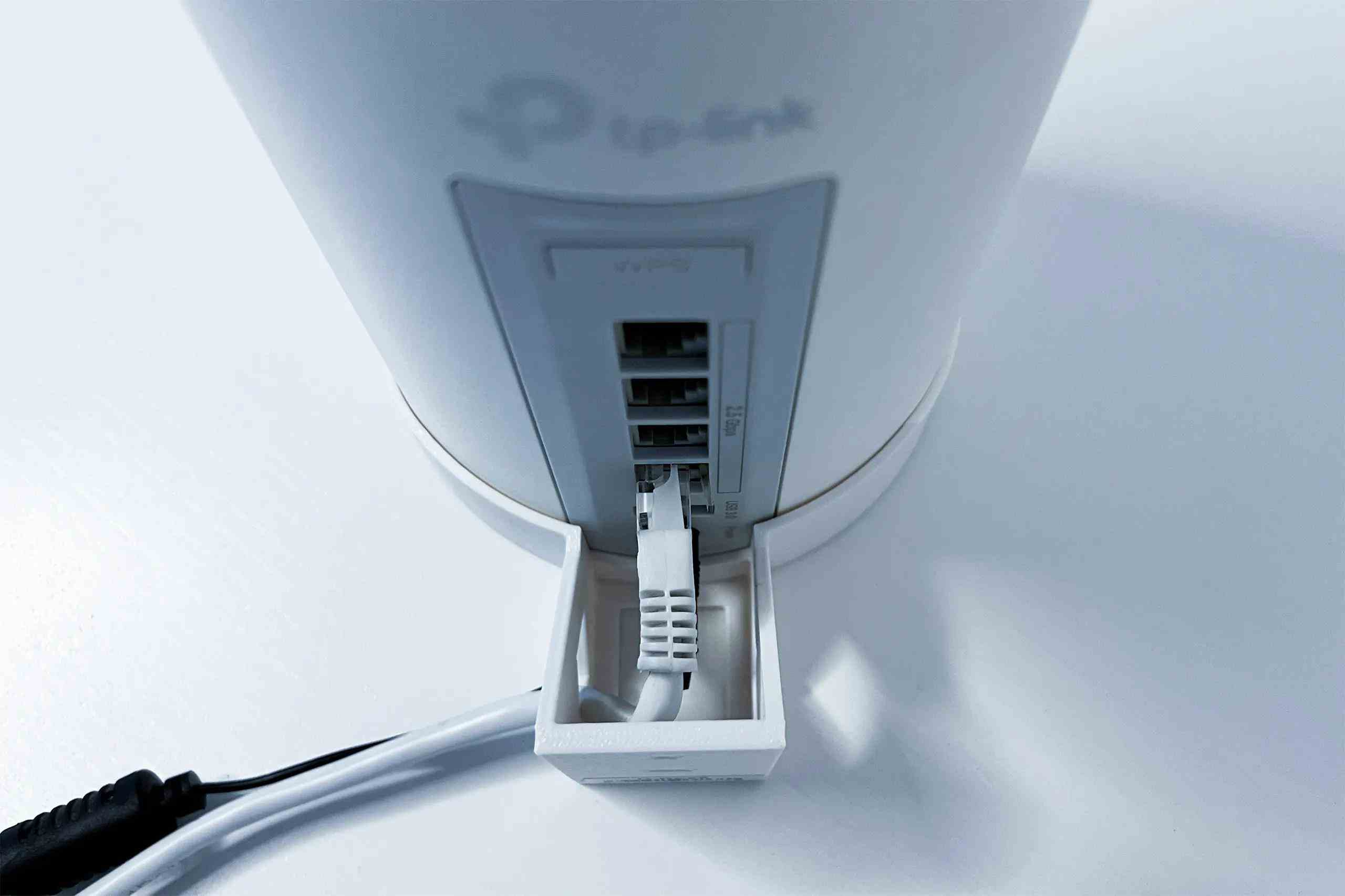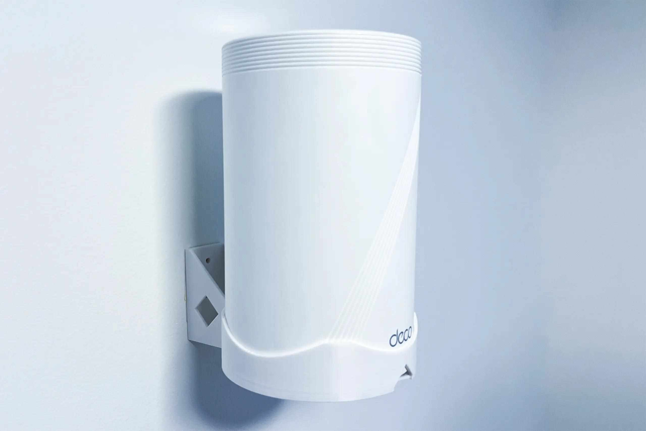 Plastový držiak na stenu pre TP-Link DECO BE65 na stenu a to pomocou dvoch skrutiek. Držiak je vyrobený z PETG materiálu na 3D tlačiarni a má bielu farbu.