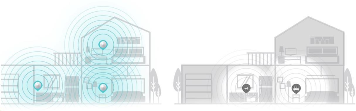 | WiFi Dosah | 3-5 izbové domy (3-balíček) TP-Link Mesh technológia Voliteľná Ethernetová spätná väzba spolupracuje na prepojení jednotiek Deco pre plynulé pokrytie 4× Antény (interné) Viaceré antény tvorí poľnopločný zosilňovač signálu na pokrytie väčších smerov a veľkých plôch Beamforming Sústreďuje bezdrôtovú signálovú silu smerom k klientom, čím rozširuje WiFi dosah |