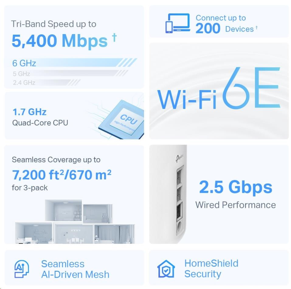 - Wi-Fi 6E pokrytie celej domácnosti – pokryte plochu až 670 m2 ničím nerušeným Wi-Fi signálom budúcej generácie a zabudnite na mŕtve zóny pokrytia a načítanie do vyrovnávacej pamäti
