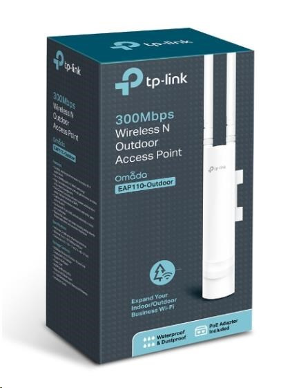 | Obsah balenia | • 300 Mbps Wireless N Vonkajší Access point, EAP110-Outdoor • Pasívny PoE adaptér • Napájací kábel • Montážne sady • Vodotesný gumový vložka • Vodotesné antény • Inštruktážny návod |