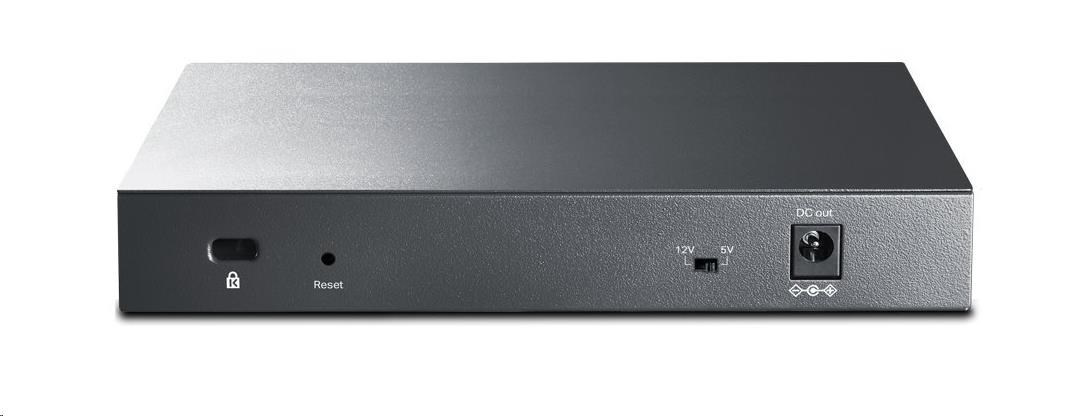 Pasívny PoE switch RP108GE (TL-RP108GE) má sedem gigabitových PoE vstupných portov, ktoré umožňujú získavať elektrickú energiu z používateľských zásuviek pomocou PoE injektorov. Vybavený jedným PoE výstupným portom môže switch napájať CPE alebo podobné zariadenie pomocou Portu 8. Výstupný DC port podporuje obe napätia 5 V a 12 V a možno ho tak použiť na napájanie zariadení ako ONT. Vďaka integrácii prepínania dát a PoE napájania do jedného zariadenia RP108GE šetrí miesto, minimalizuje množstvo káblov a eliminuje potrebu vyhradenej elektrickej zásuvky - čím znižuje náklady na inštaláciu a zjednodušuje inštaláciu PoE zariadení. Poznámka: Vstupné PoE porty podporujú pasívne 24V a 48V PoE injektory. Používajte iba jeden typ injektora, nekombinujte rôzne úrovne napätia. Úroveň napätia výstupného pasívneho PoE portu je zhodná s napätím zvoleného vstupného PoE injektora