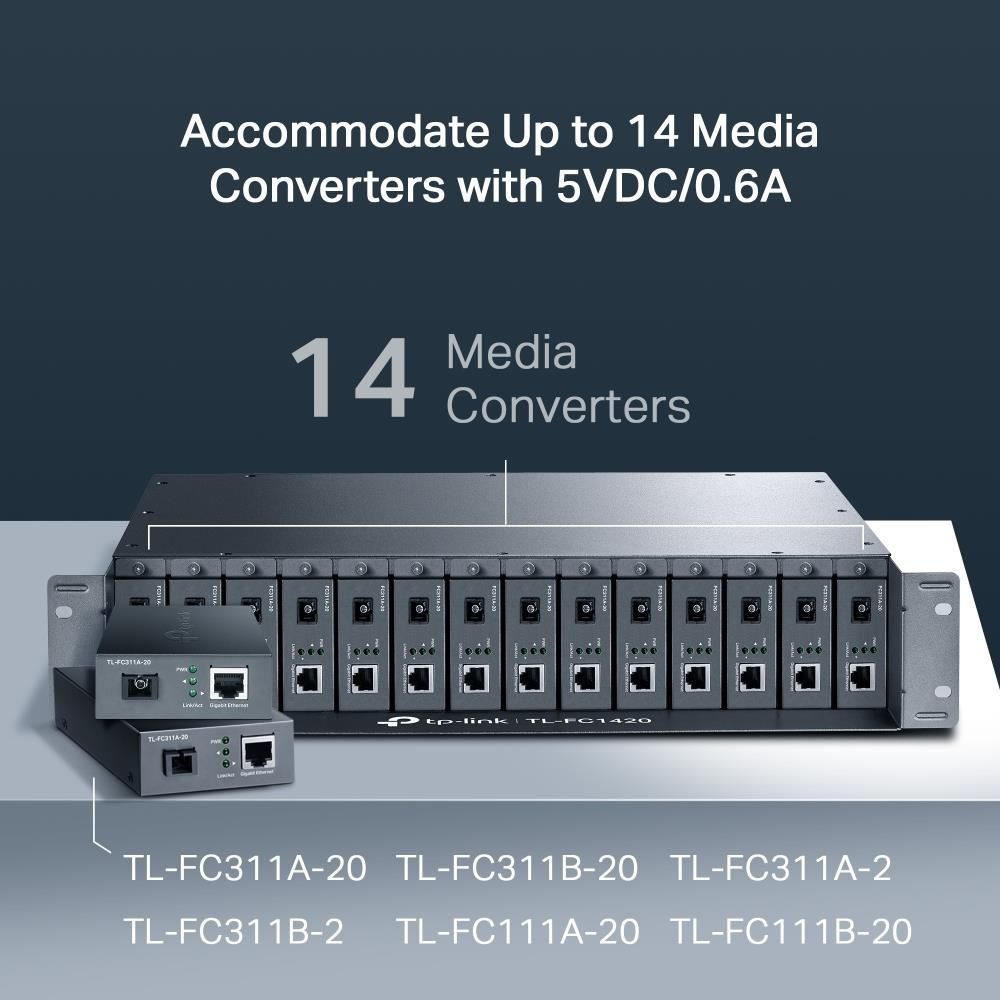 14-skladové rackové šasi TL-FC1420 je špeciálne určené na umiestnenie 14 média konvertorov od spoločnosti TP-Link na zabezpečenie centrálneho napájania, čím šetrí miesto a napájacie káble. Nepretržitý prevádzka je pre komunikáciu cez optické vedenie veľmi dôležitá, preto je šasi vybavené voliteľným redundantným napájacím zdrojom a funkciou výmeny za prevádzky, ktoré umožňujú inštaláciu / odstránenie konvertora bez vypnutia napájania šasi. Pre stabilizáciu prevádzkového výkonu a predĺženie životnosti sú navyše vo vnútri nainštalované dva chladenia ventilátory. Spolu s radom FC média konvertorov Gigabit / Fast Ethernet predstavuje zariadenie TL-FC1420 ideálne riešenie pre vašu sieť vyžadujúcu prevod médií. * Zarízení TL-FC1420 podporuje TP-Link média konvertory TL-FCXXX verzie 1.0 a vyššej. ** TL-MCRP100 V2 je možné použiť ako redundantný napájací modul v šasi TL-FC1420.